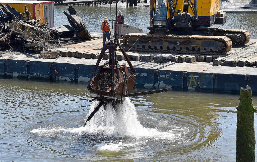 Wednesday morning, a barge carrying a crane with a clamshell bucket was picking away at the Lady Grace. A boom had been set up downriver to collect floating debris and to try to contain whatever fuel and oil was still onboard, as well as whatever was released from the muddy river bottom as the vessel was brought up in pieces. At times, larger sections of the vessel were visible above the surface, but mostly it was sections of wood hull, metal fittings and wire and rope coming out a bucket at a time.