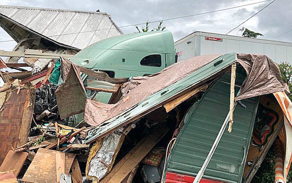 According to a State Patrol report, an International semi with two tanker trailers was eastbound at milepost 25 when it veered across the center line into the path of a westbound Kenworth semi with one trailer. The tanker rig jackknifed in the roadway while the Kenworth continued through a fence, two houses and the camper trailer. Photos from the scene show heavy damage to at least one of the homes and the camper trailer.