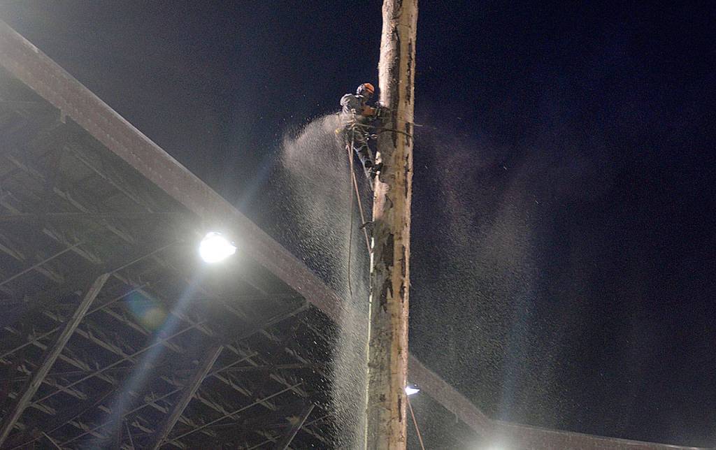 KAT BRYANT | GRAYS HARBOR NEWS GROUP                                Local logger Lee Pickett saws a log during the 2019 Playday. In the foreground is the limbing tree setup, which was new last year.