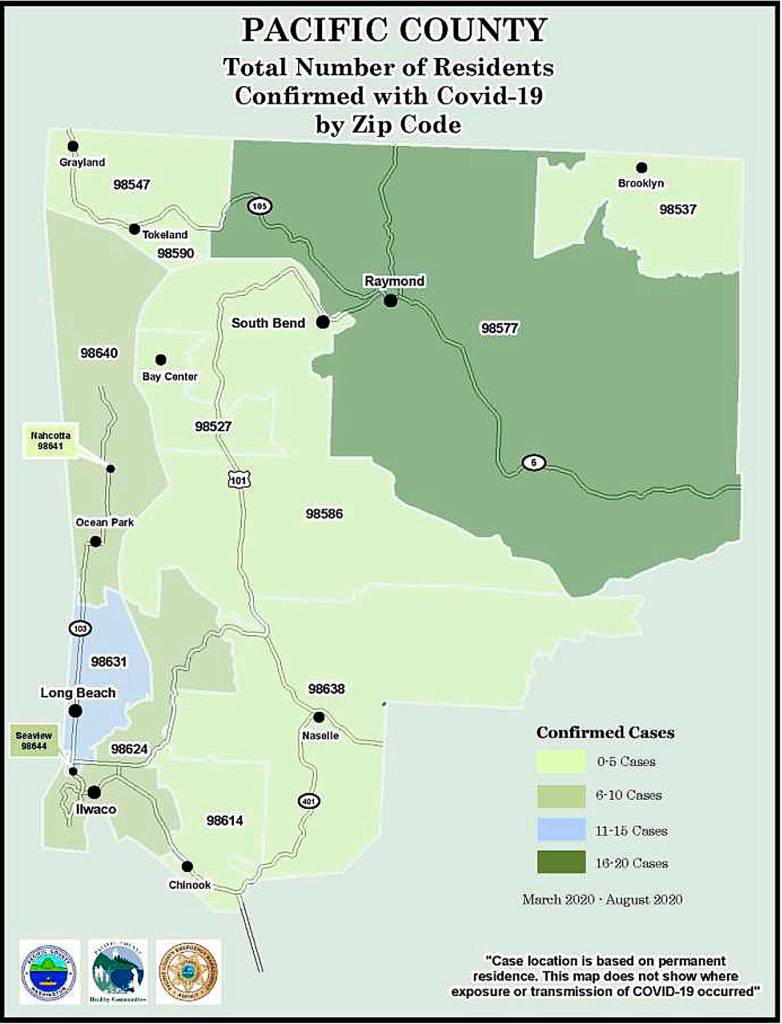 Broken down by zip code as of Wednesday, the Raymond (98577) zip code had the majority of cases, 16-20. Long Beach (98631) had 11-15. The Ilwaco and Ocean Park zip codes had 6-10 cases, and the remainder of the county’s zip codes reported 0-5 cases.