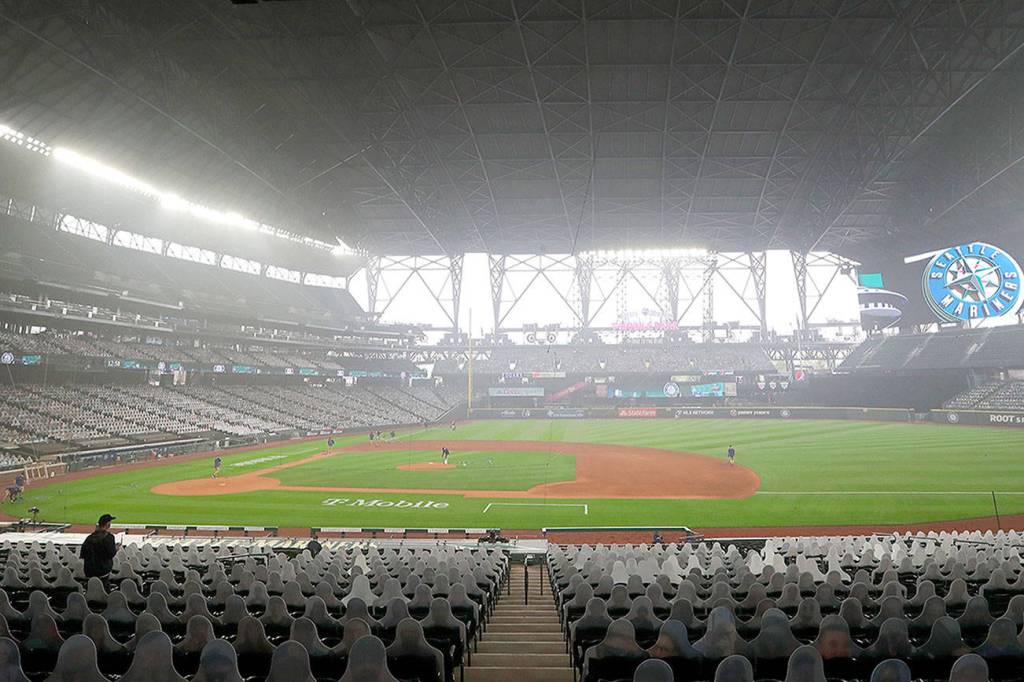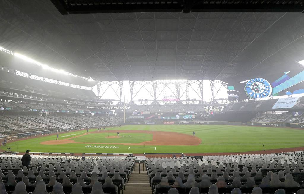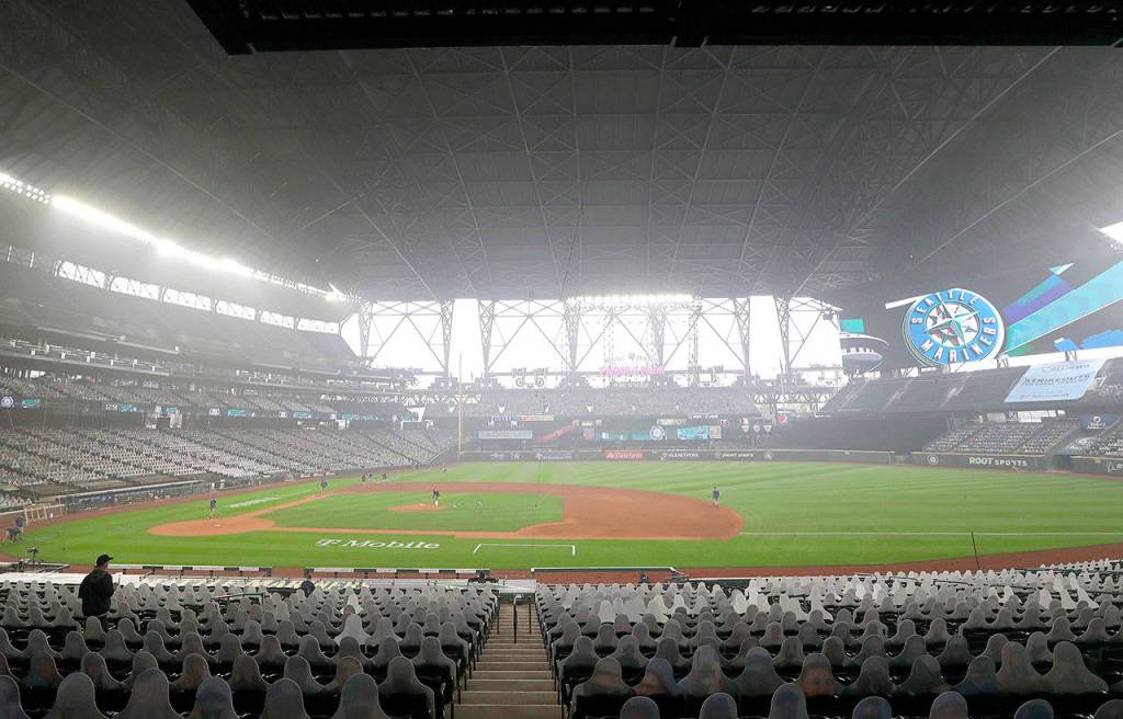 It’s hazy — even with the roof closed — as the field is prepared for the Seattle Mariners to play the Oakland Athletics in the first game of a doubleheader on Monday at T-Mobile Park in Seattle.                                 Ken Lambert /