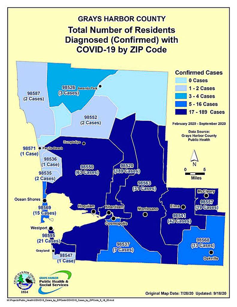 The Public Health zip code map of the county updated Friday showed 189 cases in the Aberdeen zip code, compared to 63 in the Hoquiam zip code and 42 cases in the Elma zip code. The Ocean Shores zip code had 15 cases as of Friday, the Westport zip code 21. The Montesano and McCleary zip codes had 31 and 19 Friday, respectively.