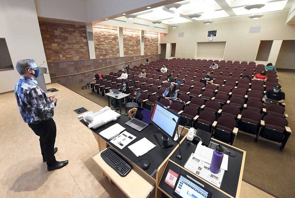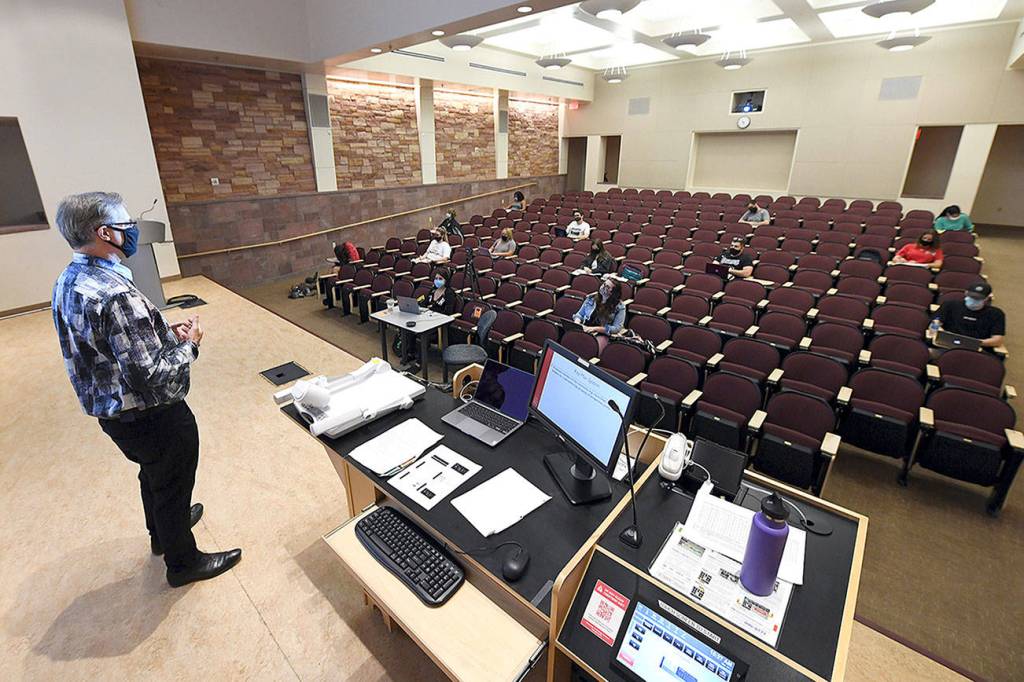 UNLV Department of Criminal Justice chairman and professor Dr. Joel Lieberman teaches a criminal justice class at UNLV amid the spread of the coronavirus in Las Vegas. Some universities that hold in-person classes have faced a spike in COVID-19 cases. (Ethan Miller/Getty Images)