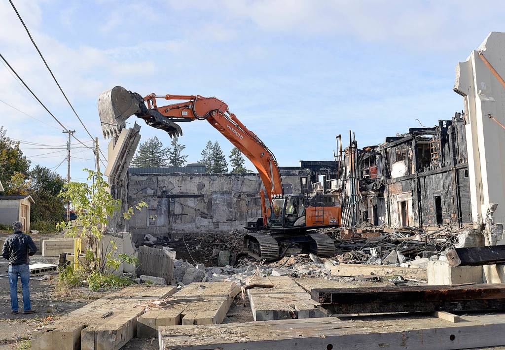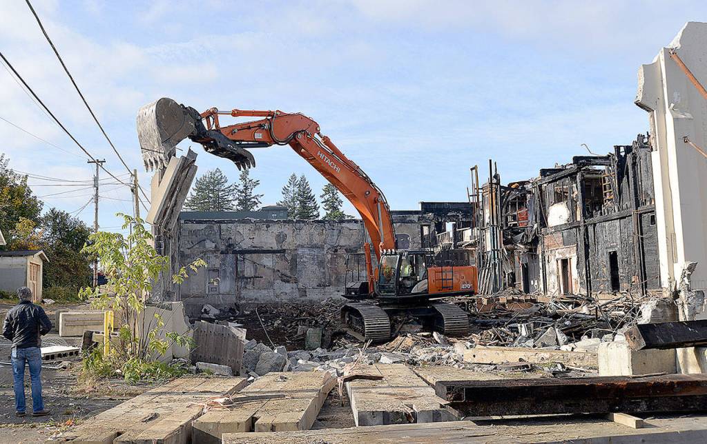 (DAN HAMMOCK | The Daily World)Crews from Rognlin’s tear down the southeast walls of the Aberdeen Armory building on East Third Street in Aberdeen on Oct. 28, 2019. The building, which burned June 9, 2018, is the former home of the Aberdeen Museum of History.