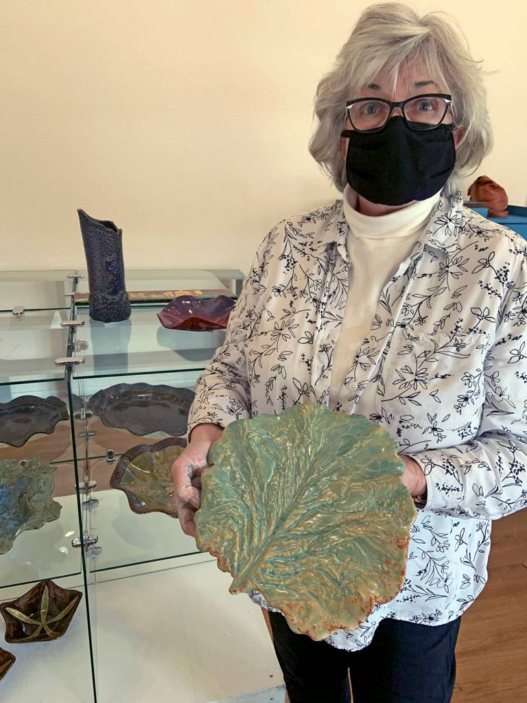 Melanie Knight shows a plate she created with the imprint of a natural leaf from her garden. It’s one of many pieces displayed for sale in the gallery.