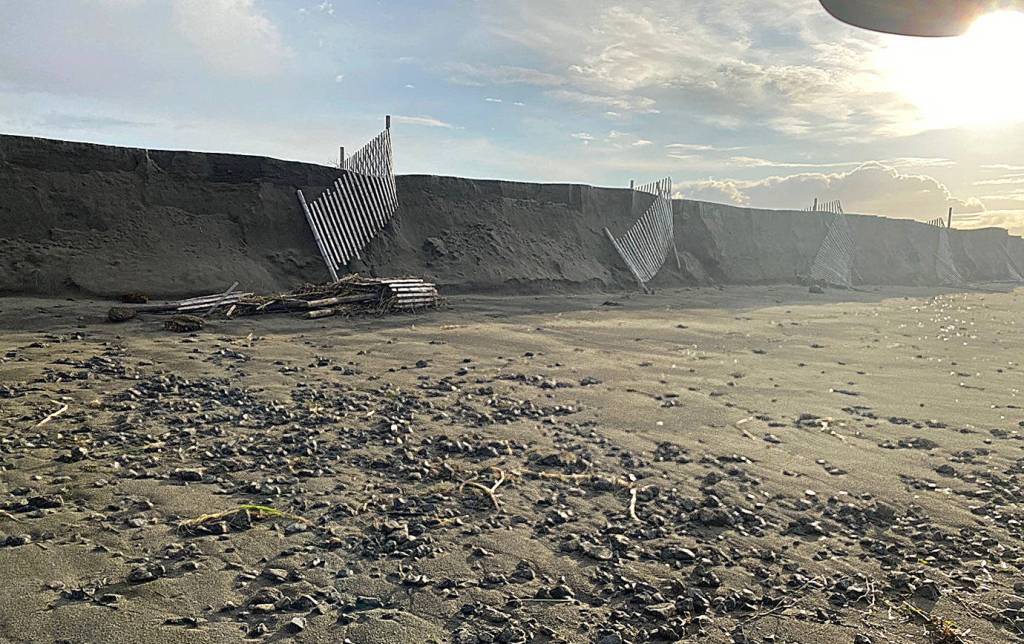 “A scarp opened up below ‘Metal Marcy’ (a piece of metal art in the shape of local photographer Marcy Merrill at the end of old State Route 105) and the pre tsunami layer in the big dune between Sea Mobile (Road at the end of old State Route 105) and Tamarack (Street to the north) is showing again. We plan to get these patched before the next king tides.”