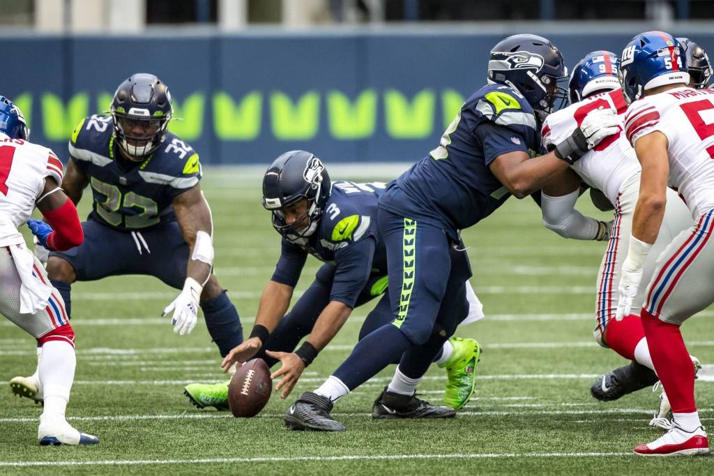 Seattle quarterback Russell Wilson fumbles the snap and the New York Giants recovered in the second quarter on Sunday at Lumen Field in Seattle.