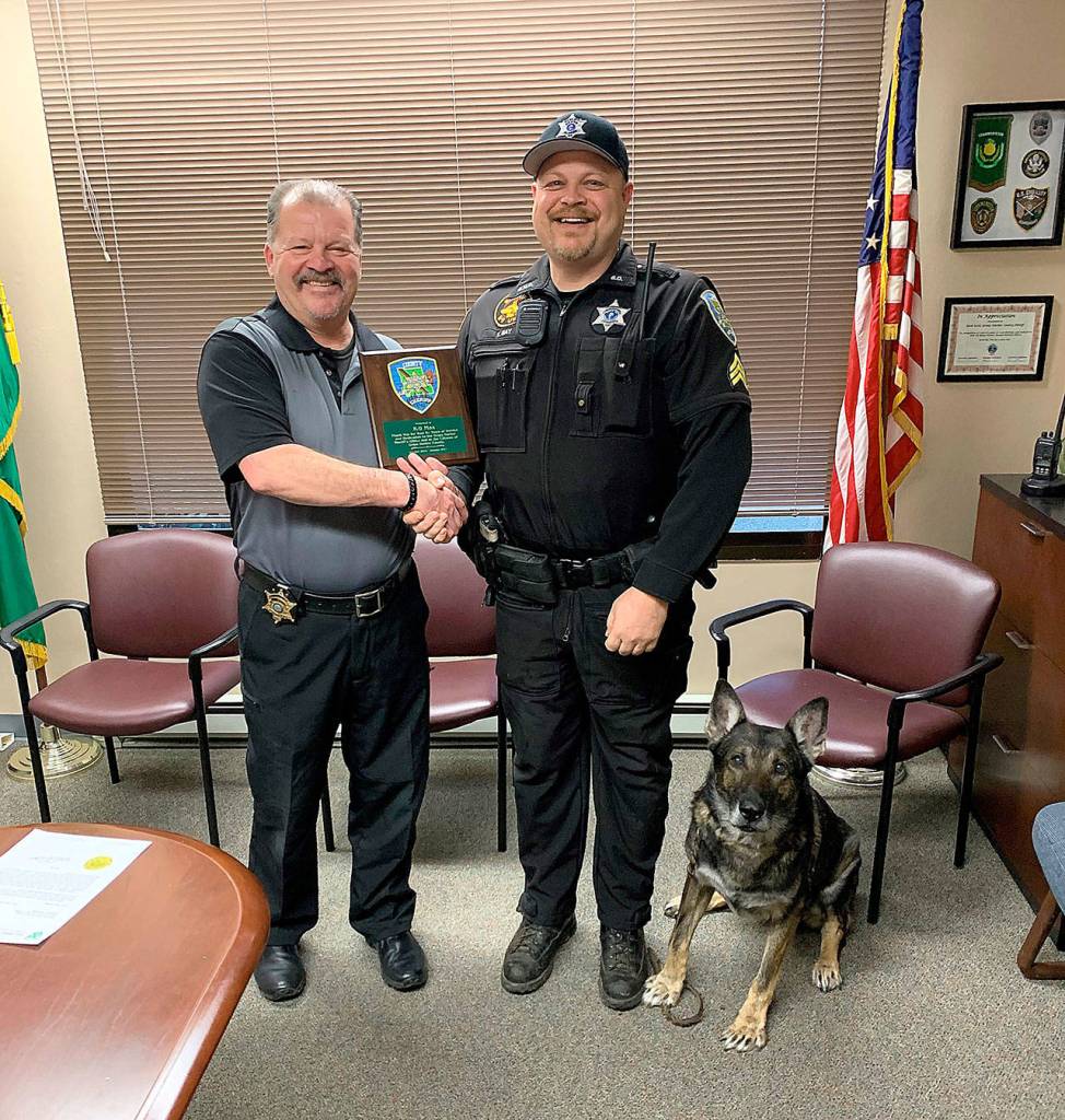 Grays Harbor County Sheriff Rick Scott, left, congratulates K9 officer Max on his handler, Sgt. Tracy Gay, for Max’s retirement after more than eight years on the force.