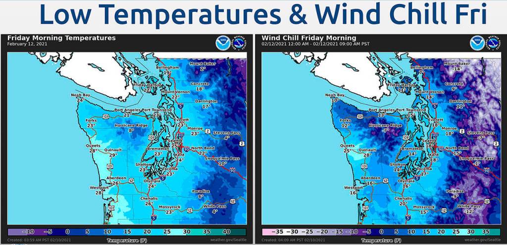 Wind will accompany the cold front heading into the region, with gusts to 45 mph on the coast and 25 mph in Aberdeen and Hoquiam dropping wind chill temperatures into the teens Friday.