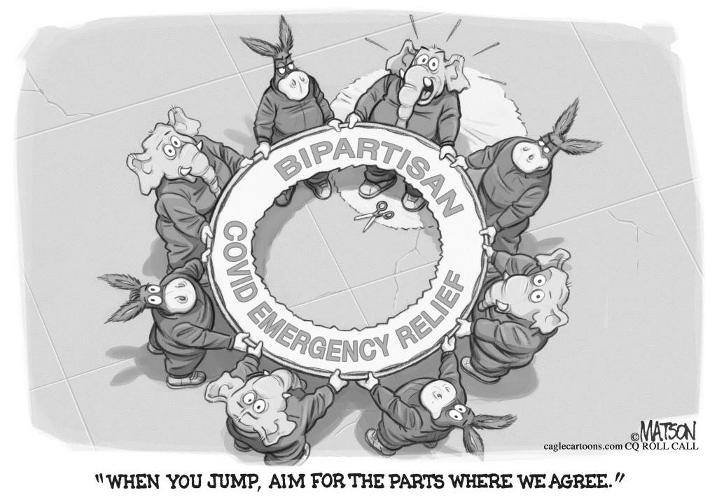 Republicans and Democrats worked together to pass a large COVID-relief bill last spring, and did it again just a few weeks ago. The second one was passed after Biden had won the election and the Electoral College had met. Republicans knew that any positive effect it had would buoy Biden politically, and did it anyway.
