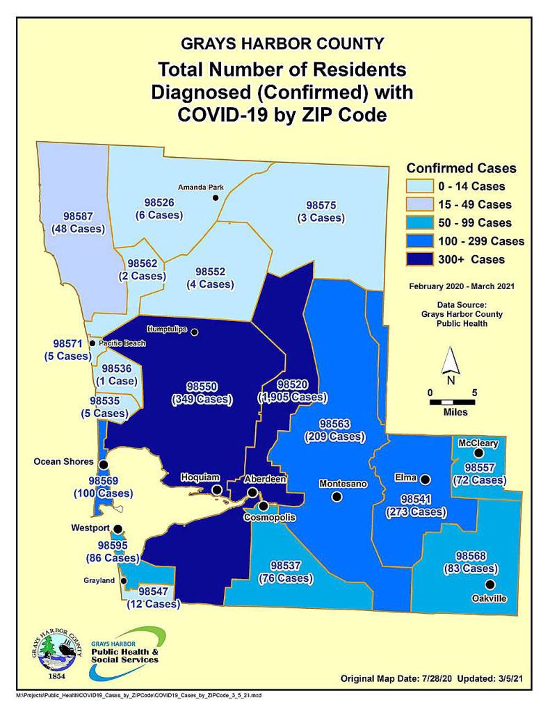 An updated zip code county map Friday shows more than half of the cases attributed to the Aberdeen 98520 zip code, 1,905. Second highest is Hoquiam with 349, then Elma’s 98541 zip code with 273. Along the beaches, Ocean Shores reached 100 cases, and Westport’s 98595 zip code had 86.