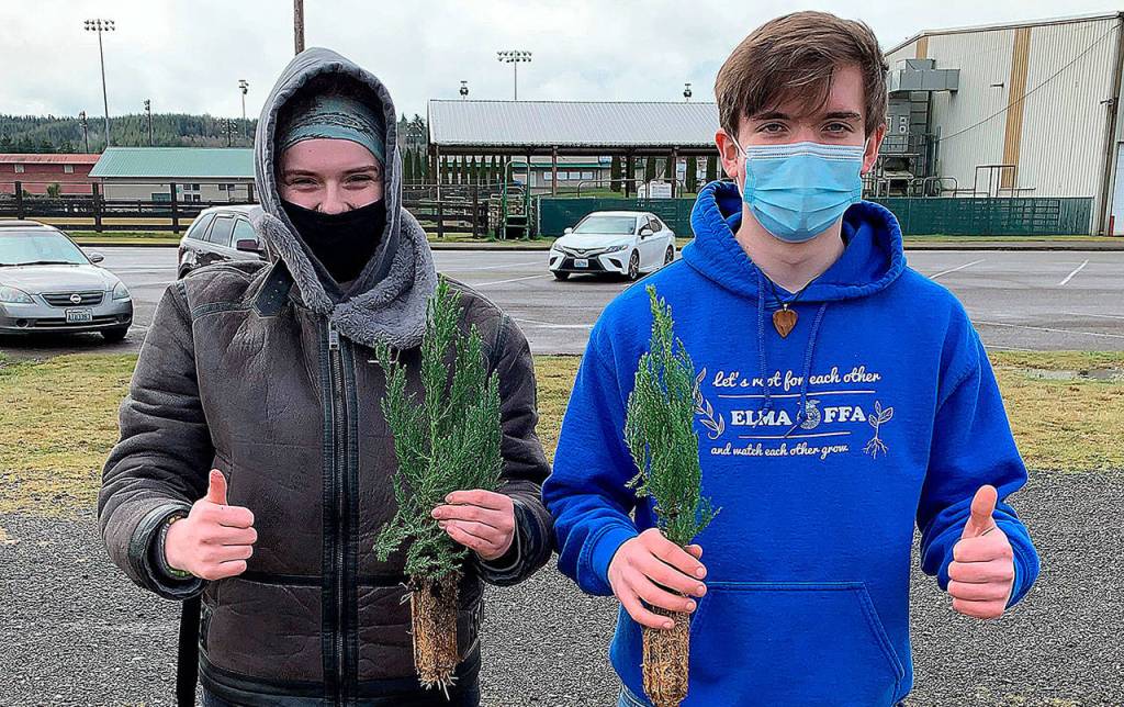 Volunteers from the Elma FFA were there to hand out the trees as those who had emailed seedling requests picked them up drive-through style on a soaking wet weekend.