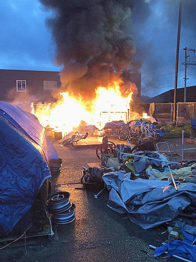 Dark-colored smoke was reported from East Aberdeen, what sounded like explosions were reported by the 911 caller, and some photos showed 20-foot flames visible over the fence around the camp. Photos on social media showed burned propane tanks and pallets inside the fenced-area. A tarp was placed back over the fence shortly after the fire.