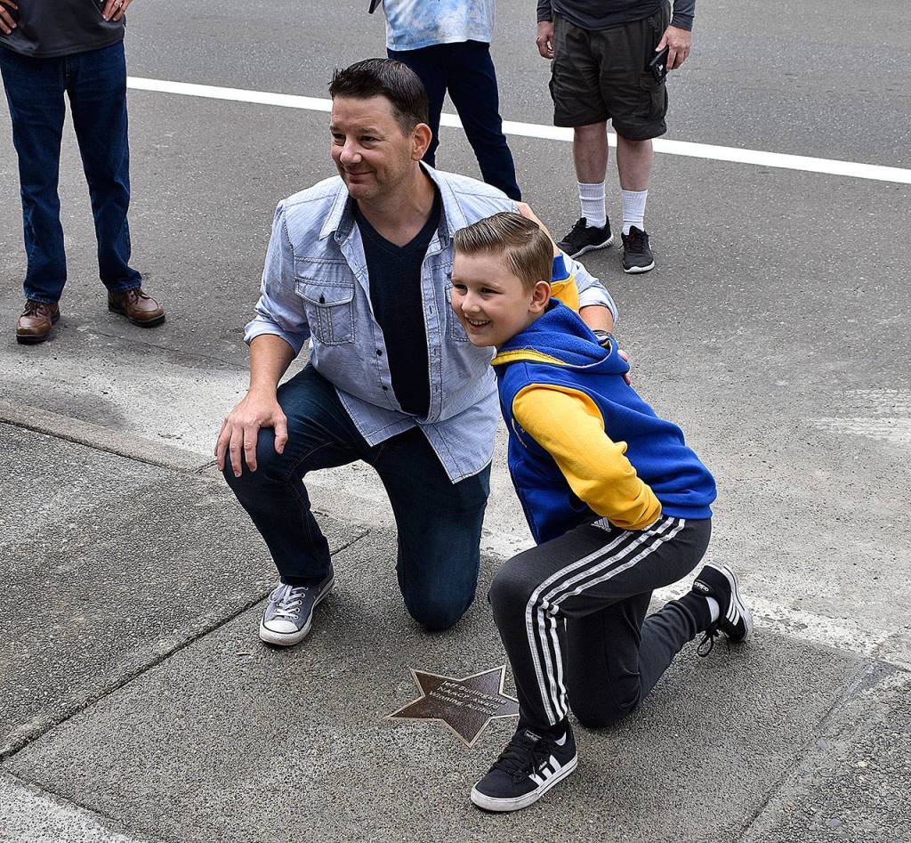 Burlingame pulled back a black cloth that had covered the newly-installed bronze star, made by Aberdeen’s own Bergstrom Foundry, kneeling for a moment to kiss it before posing for pictures next to it with his son, Grayson, whom he said was named for Grays Harbor.