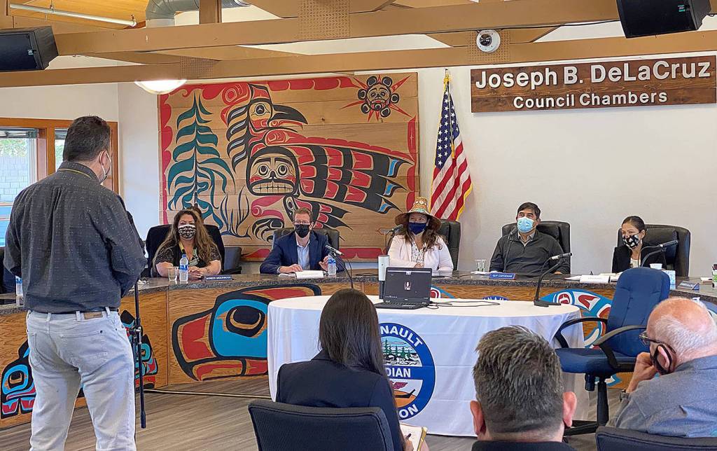 Suquamish Tribal Chairman Leonard Foresman, left, speaks to U.S. Rep. Derek Kilmer and U.S. Secretary of the Interior Deb Haaland at a listening session inside the Quinault Indian Nation’s Joseph B. DeLaCruz tribal council chambers in Taholah Monday. (Courtesy U.S. Rep. Derek Kilmer)