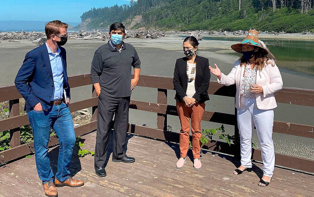From left, U.S. Rep. Derek Kilmer, Quinault Indian Nation President Guy Capoeman, U.S. Secretary of the Interior Deb Haaland and Quinault Indian Nation Vice President Fawn Sharp talk climate resiliency and village relocation in Taholah.
