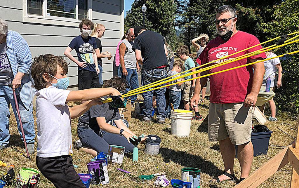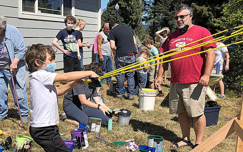 “Kids, parents, grandparents all battled getting slick paint into balloons before they exploded in hand,” said Judi Lohr of the Cosi Art Center. “The trebuchet, built by the Grays Harbor College carpentry program, was next. Young and old gave it a try. Aiming high and low, the wall was peppered with ‘splats’ of many colors. A little physics combined with a lot of paint for Phase One of an anticipated summer’s end project.”