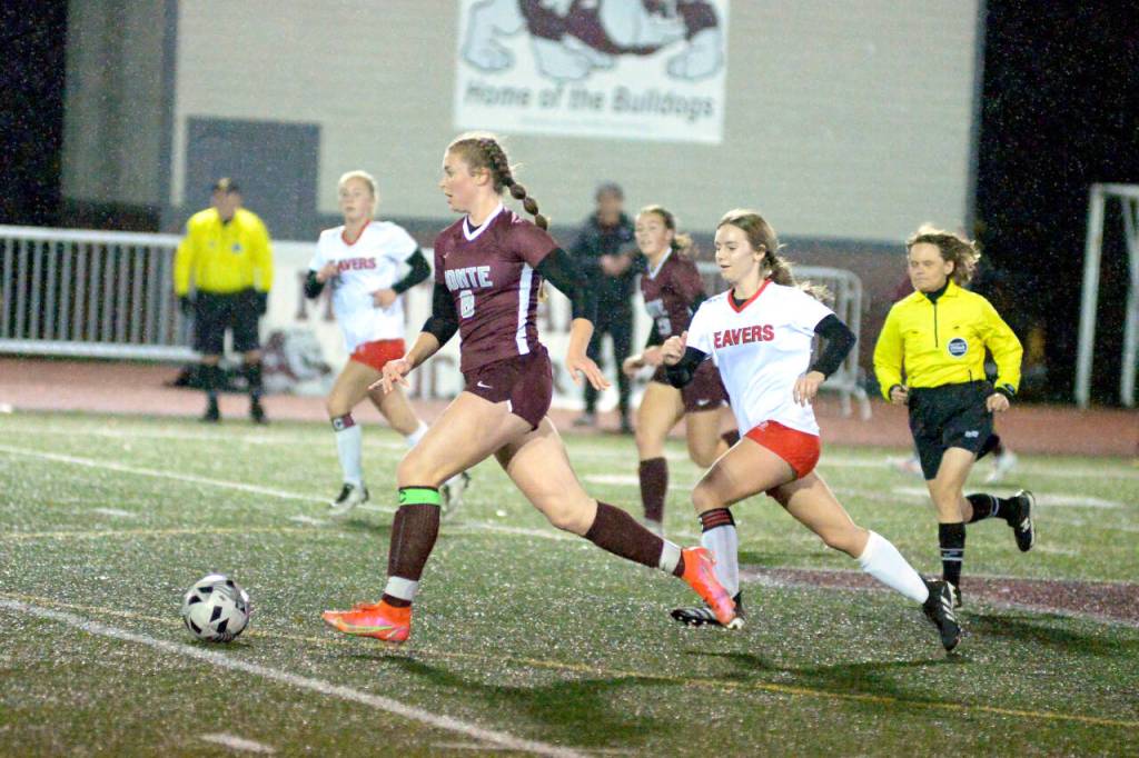 In the seventh minute of the game, Monte earned a corner kick off of a Morrison push down the wing. Bulldogs junior forward Anabelle Estrada delivered the corner directly toward midfielder Paige Lisherness. The reigning league defensive MVP got her head on the ball, redirecting it above leaping Tenino keeper Trinity Tafoya for a 1-0 lead.