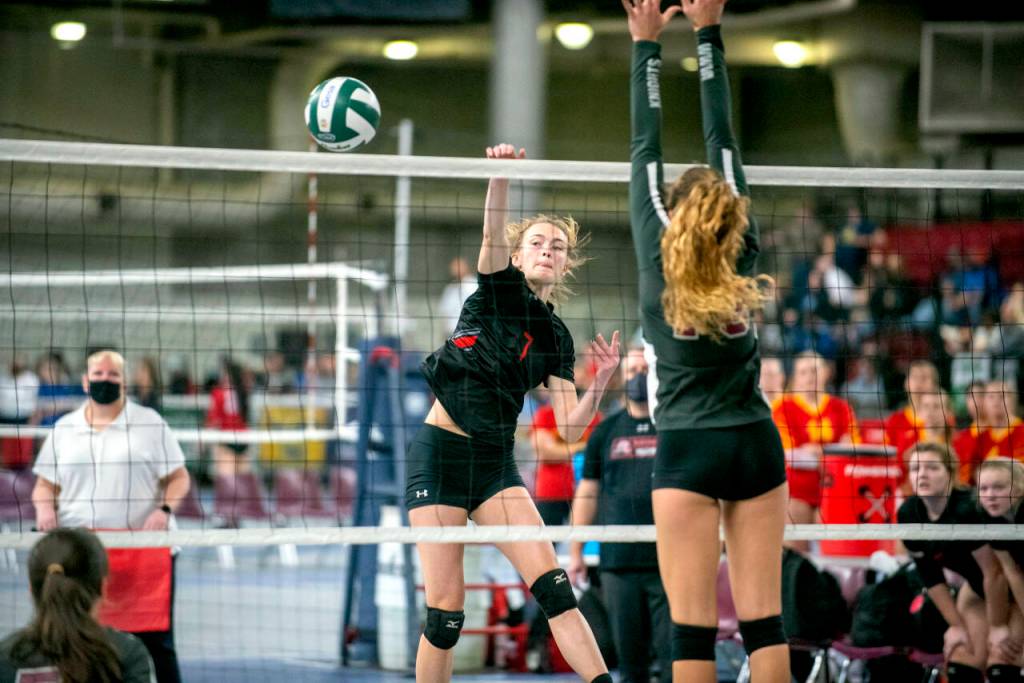ERIC TRENT | THE CHRONICLE Raymond’s Kyra Gardner scores a point off a kill against Walla Walla Academy in the 2B State Volleyball Tournament semifinals on Friday at the SunDome in Yakima.