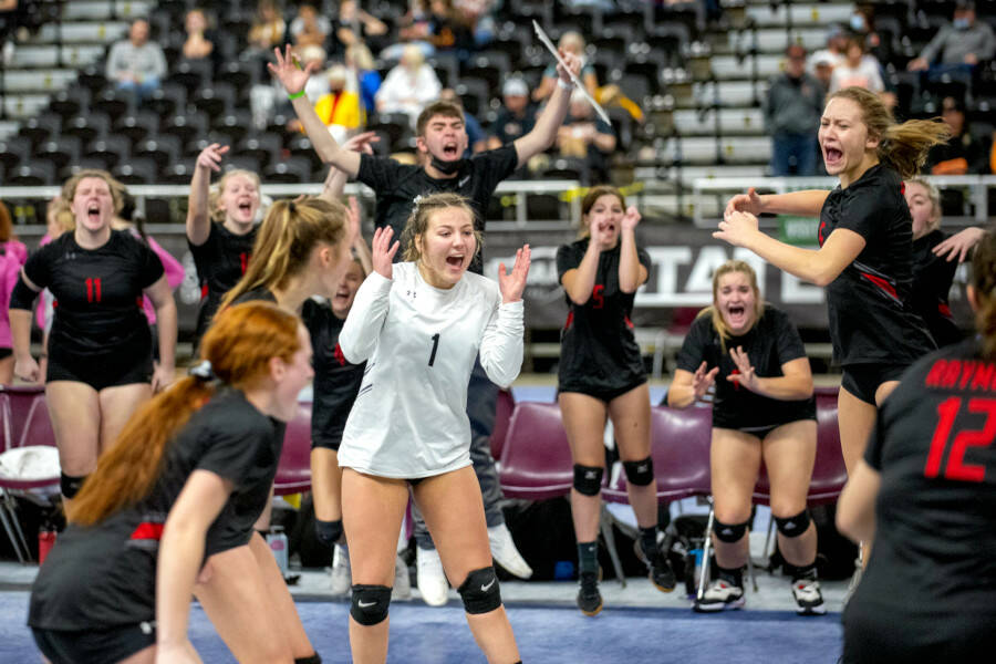 ERIC TRENT | THE CHRONICLE Raymond’s Kyndal Koski (1) and Karsyn Freeman, right, celebrate with their teammates after scoring a point against Walla Walla Academy in the 2B State Volleyball Tournament semifinals on Friday at the SunDome in Yakima.