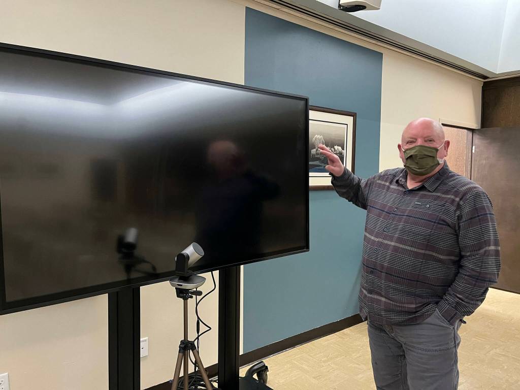 Aberdeen Mayor Pete Schave shows off the new 70-inch television screen that will help council members see members of the public who tune in, via Zoom, to council meetings when their meetings change from a remote setting to a hybrid setting. Currently, Schave said the plan is to switch from remote to hybrid at the Wednesday, March 9, 2022 meeting. (Matthew N. Wells | The Daily World)