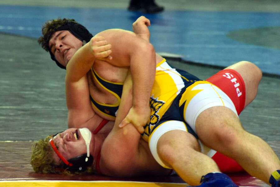 PHOTO BY SUE MICHALAK BUDSBERG Aberdeen’s Erick Hayter-Ramsey, top, wrestles at the Mat Classic XXXII state-championship tournament on Friday at the Tacoma Dome.