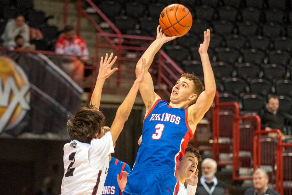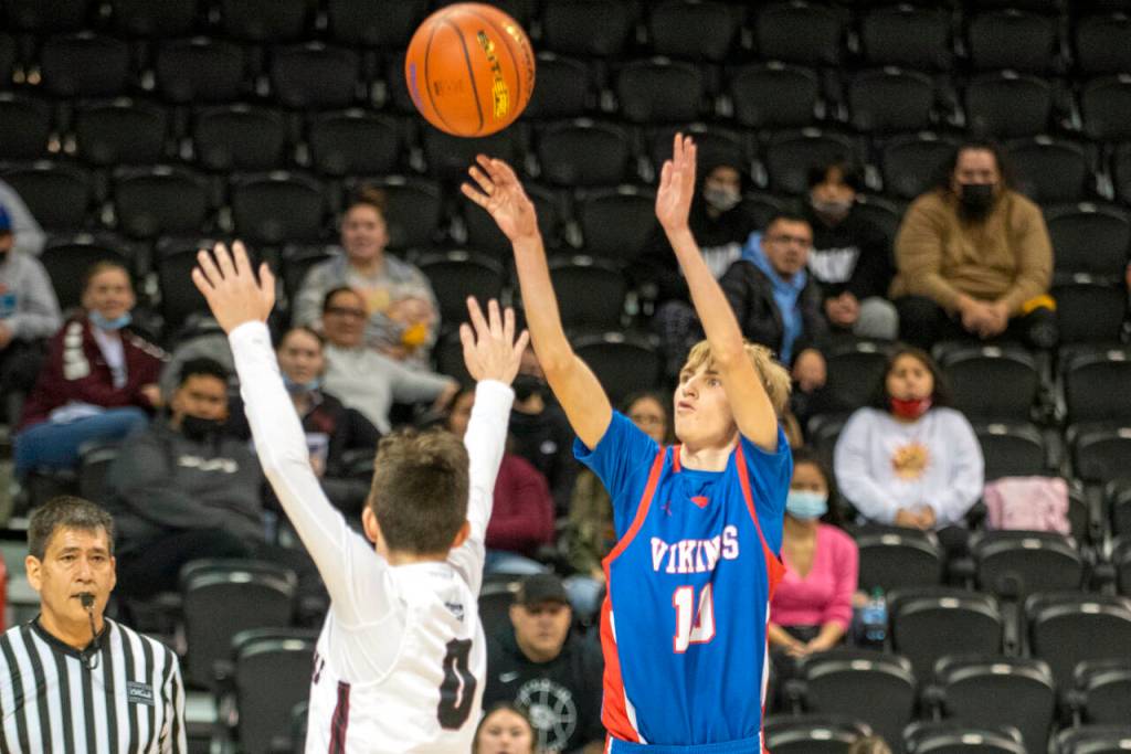 ERIC TRENT | THE CHRONICLE Willapa Valley senior Tyler Adkins (3) take a shot against Lummi Nation’s Tobias Francis during the Vikings’ 65-59 loss in a 1B State Boys Basketball Tournament elimination game on Friday at the Spokane Arena.