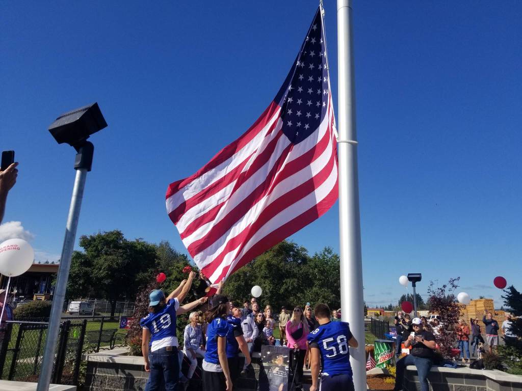 What originally started as a desire to install a flagpole slowly evolved into a flag pavilion with a dog park attachment. Elma High School football players were tasked with raising the ceremonial flag during the grand opening of the Martin Family Dog Park on Saturday, Sept. 24, in Elma. (Allen Leister | The Daily World)