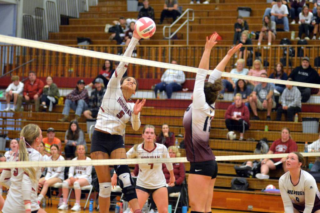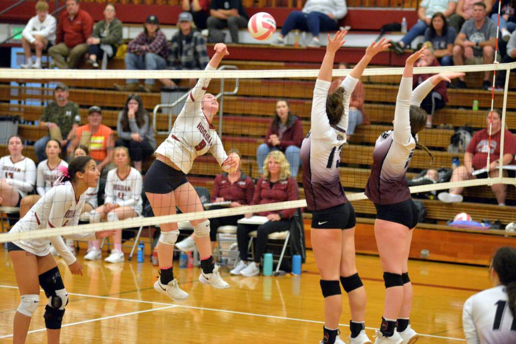 Hoquiam middle blocker Chloe Kennedy (5) records one of her game high 23 kills in a 3-1 victory over Montesano on Tuesday at Hoquiam Square Garden.