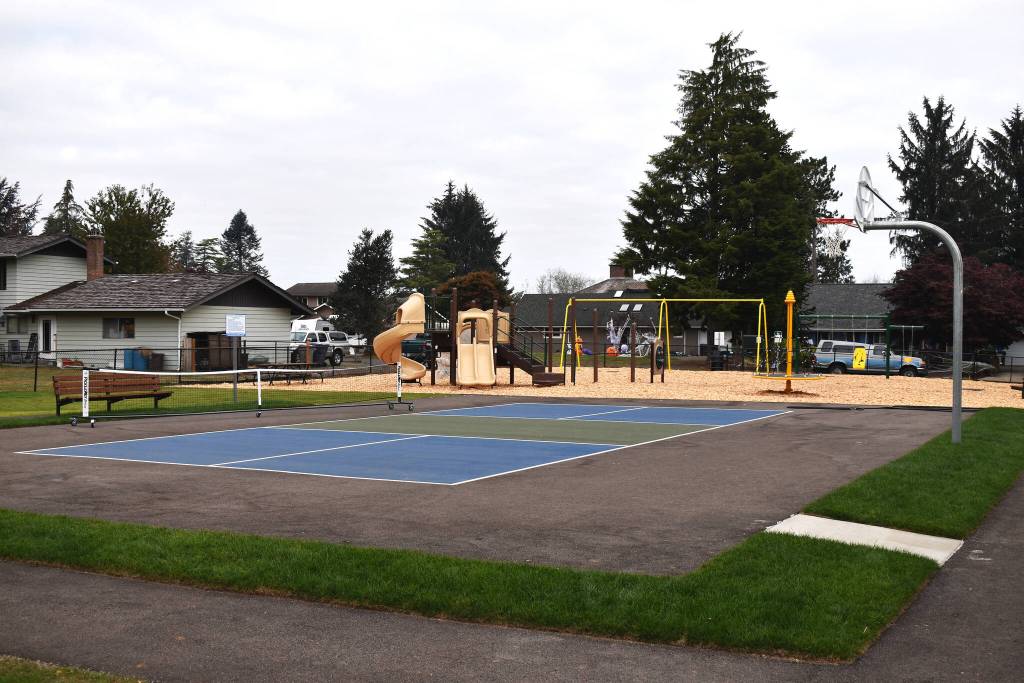 While the park had “a lot of uneven open space, with numerous stumps and clumps of grass,” it is now covered with evenly-laid, soft green grass. The play areas, such as the basketball and racquetball court — with retractable racquetball net, has what looks like freshly-painted lines. And the play surfaces are clean and without cracks.