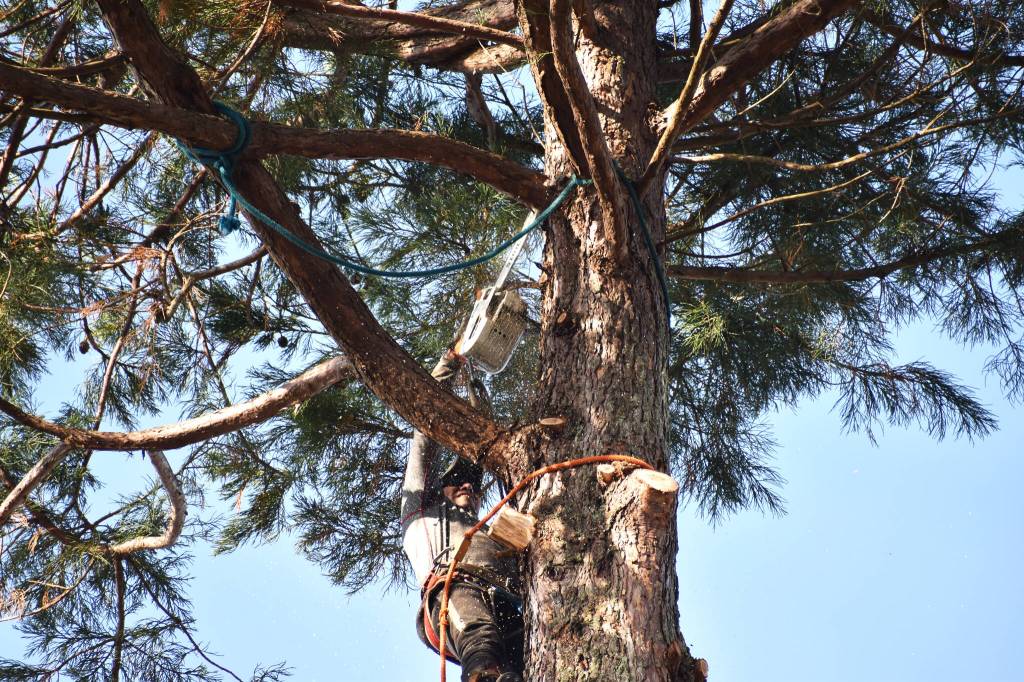 Mariano Pineda, a tree and branch trimmer, chain saws through a limb near the top of an estimated 105-foot tall Redwood tree. The tree has stood outside Dick and Judy Isaacson’s home on L Street in Aberdeen since 1907, when the Hood family owned it. In 1923, Dick’s grandparents bought the home, and then in 1949, his parents bought the home. The tree is coming down to avoid any potential accidents. A couple limbs, with help from wind two months ago, have already fallen. Fortunately, nobody was hurt, and no damage resulted from the falling limbs. Judy Isaacson, who on Wednesday morning was standing outside and across the street from her home, watched in awe as the limbs came down carefully. “This is the exciting part, I think,” Isaacson said. She marveled at how Pineda climbed around the tree trunk. “Pray for him, OK?” Judy Isaacson asked as she watched Pineda work.