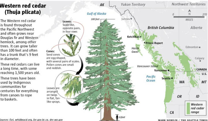 Red cedars have been used by Indigenous communities to build homes, canoes, totem poles, rope, instruments, utensils, bowls, blankets, baskets and more. The tree’s natural oils and buoyancy help make it water- and rot-resistant and therefore ideal for use in boats, rooftops and clothing.