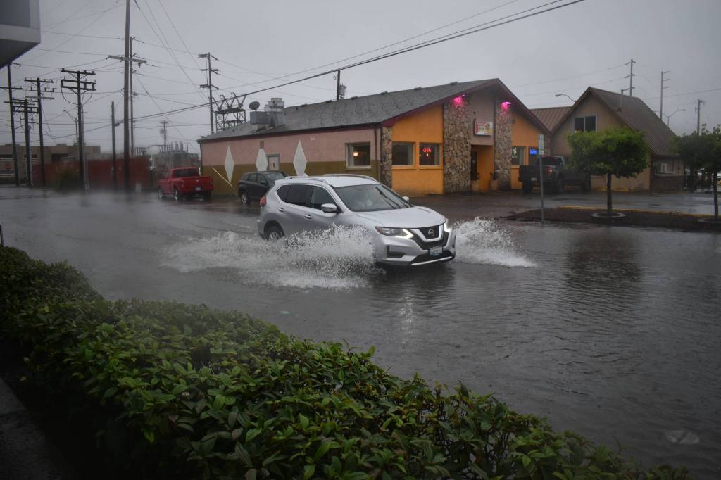 A car slogs through a swamped road on Friday, Nov. 4 on M Street in Aberdeen. Several inches of stormwater covered the road and spilled onto the sidewalk.