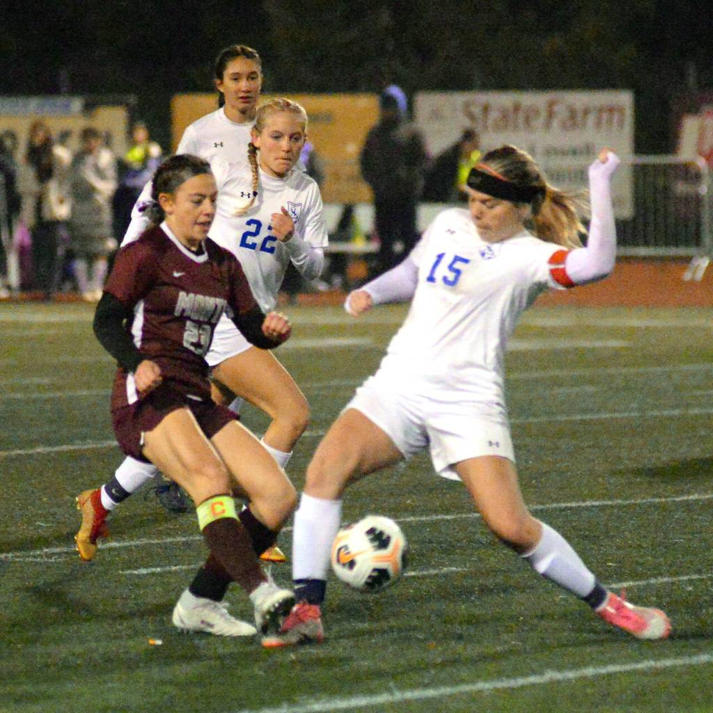 Montesano midfielder Jaiden King (23) sends the ball forward while La Salle’s Hazel Jones defends during the Bulldogs’ 3-1 victory in a 1A State first-round playoff game on Wednesday at Jack Rottle Field in Montesano.