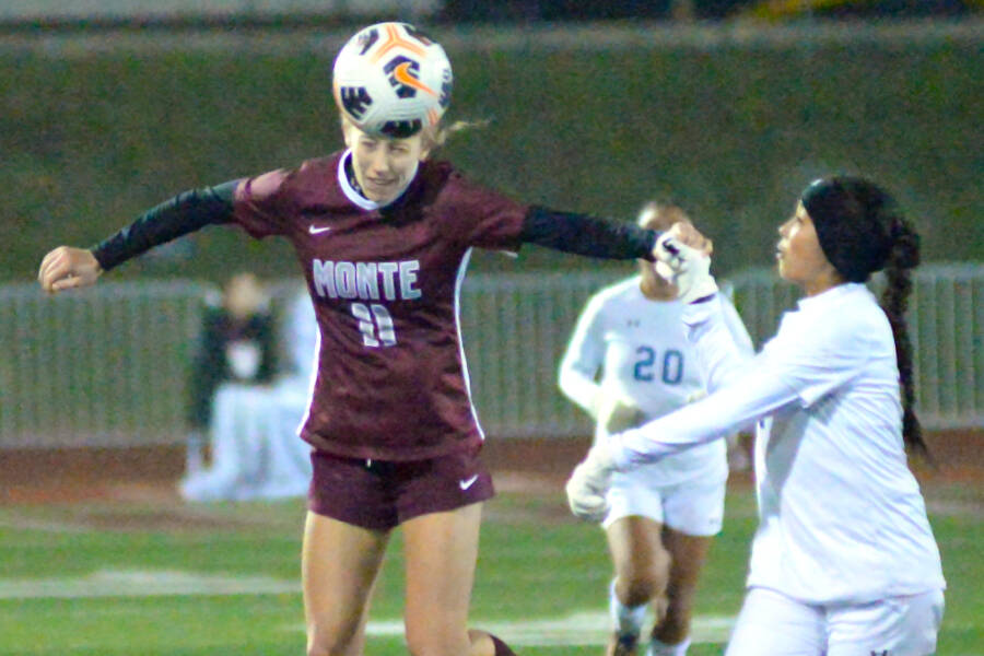 Montesano senior Lilly Causey (11) heads the ball while La Salle’s Brooke Gaytan during the Bulldogs’ 3-1 victory in a 1A State first-round playoff game on Wednesday at Jack Rottle Field in Montesano.