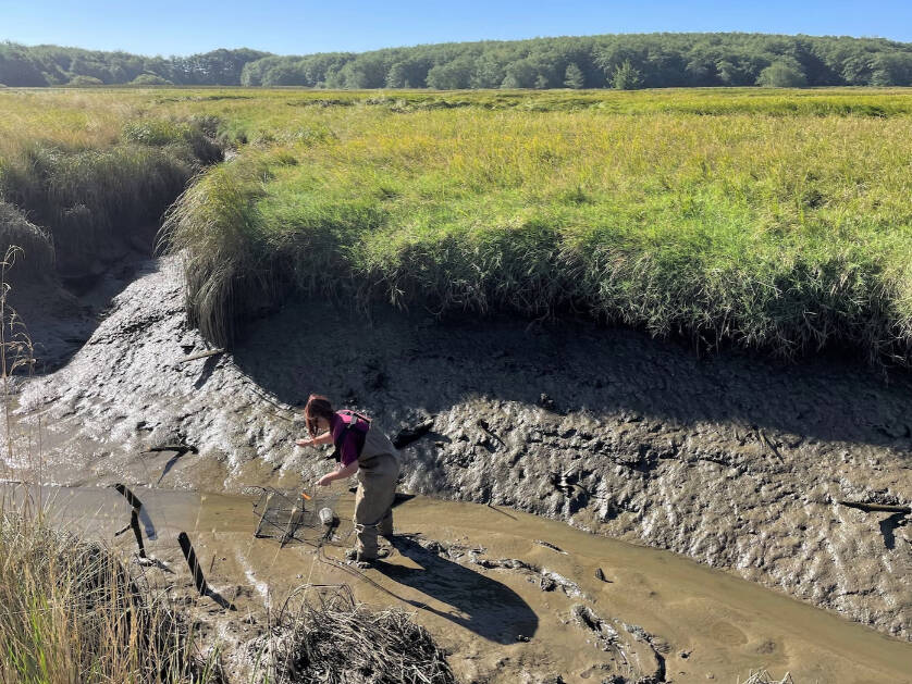 A technician sets a trap for European green crab on a low tide in Willapa Bay National Wildlife Refuge. Trappers found 134,000 green crabs in Willapa Bay in 2022, more than anywhere else in Washington.