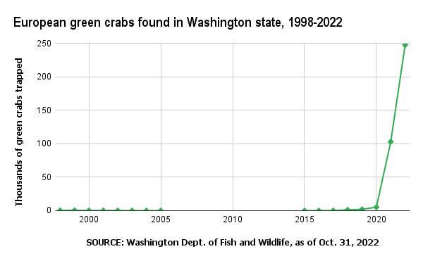 “Based on the information we have, it has been a rapidly expanding population,” said Washington Department of Fish and Wildlife biologist Allen Pleus, the state’s green crab incident commander.