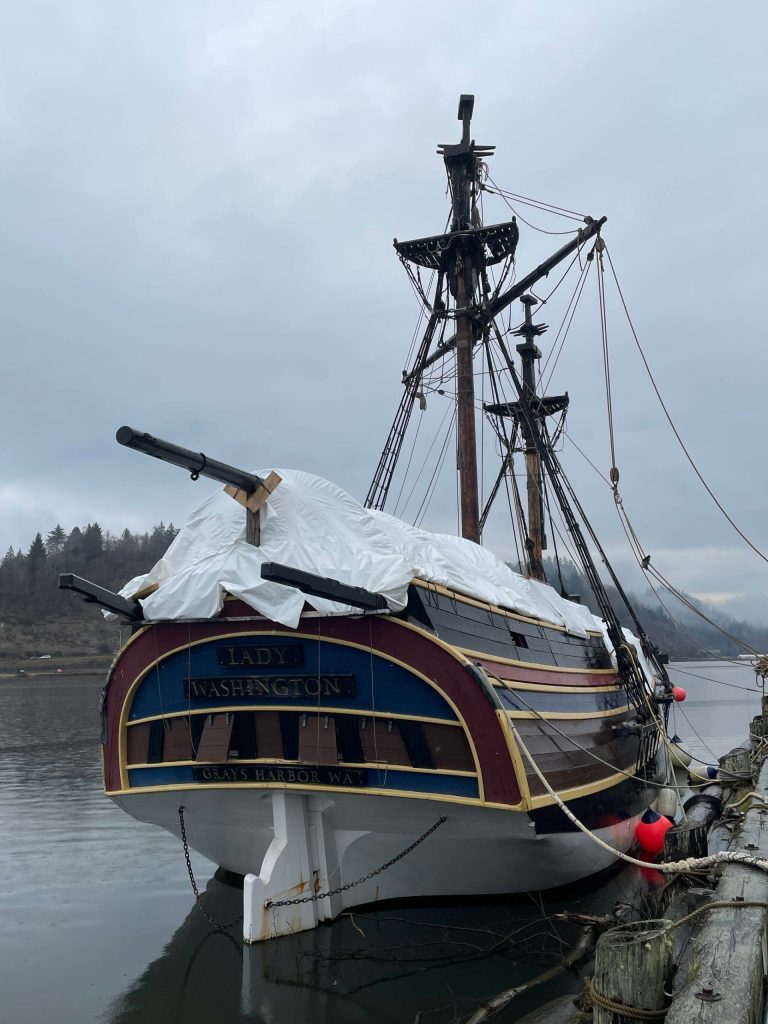Laid up alongside the pier in South Aberdeen with her masts and spars struck for the winter, the Lady Washington isn’t much to look at as she overwinters.