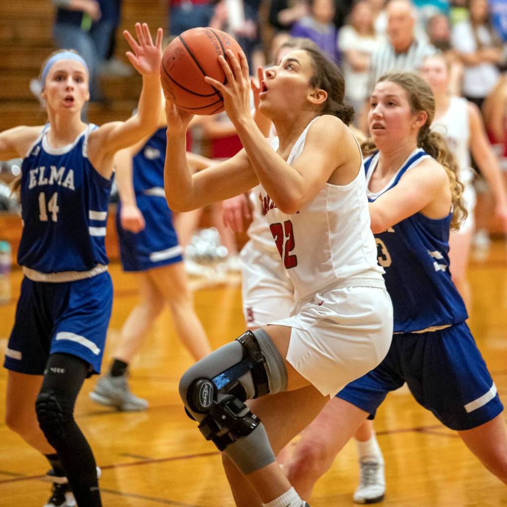 Scoring: Elma — Monroe 8, Spencer 8, DeMoss 6, Johanson 2, Rambo 2, Moore 2. Hoquiam — Folkers 15, Bonney-Spradlin 13, Kennedy 11, Cady 8, LaBounty 2, Brodhead 2, Howard 2.