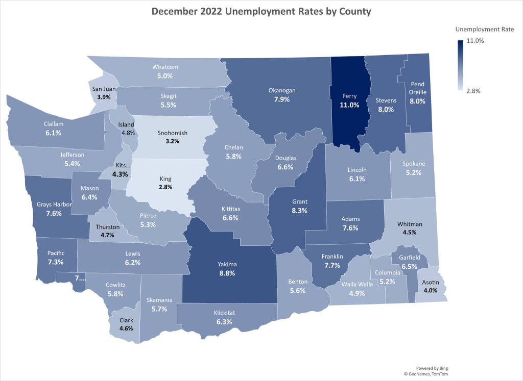 Despite dropping from the fourth-highest unemployment rate to a tie for the eighth-highest throughout Washington, Grays Harbor County still saw a rise in the overall unemployment rate according to the state’s Employment Security Department’s (ESD) December 2022 statistics released last week.