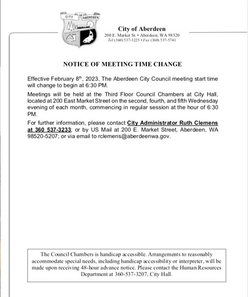 For further information, residents should contact Ruth Clemens, city administrator for the city of Aberdeen. They can call her at 360-537-3233; correspond via U.S. Mail at 200 E. Market St., Aberdeen, WA 98520-5207, or via email at rclemens@aberdeenwa.gov.