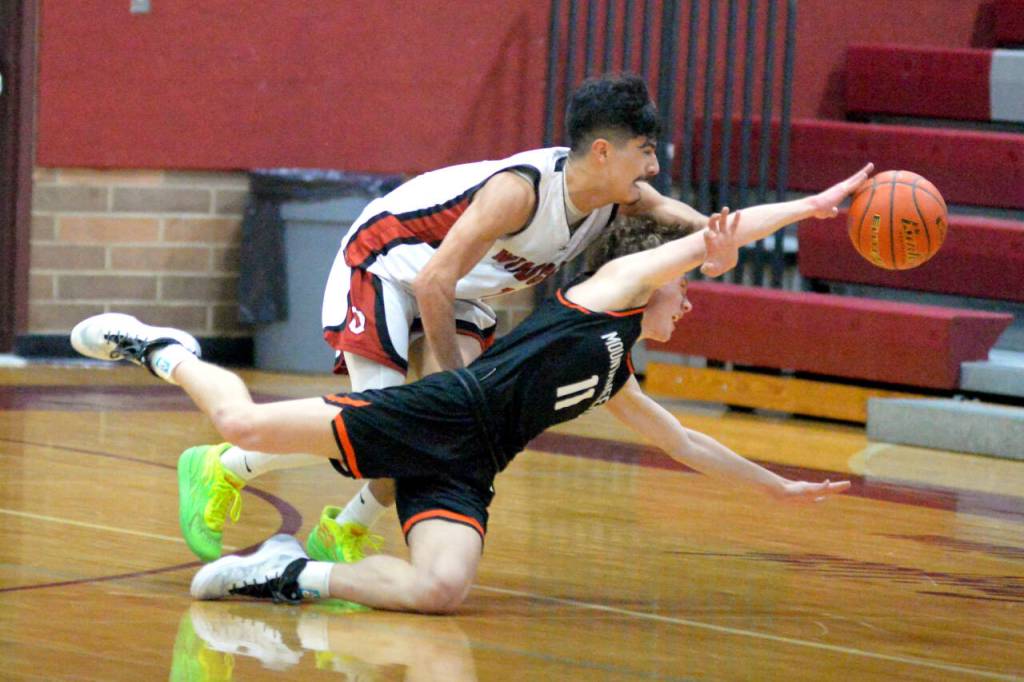 RYAN SPARKS | THE DAILY WORLD Ocosta’s Josh Figueroa, top, chases a loose ball against Rainier’s Jimmy Meldrum during the Wildcats’ 64-62 loss in the first round of the 2B District 4 Tournament on Saturday at Montesano High School.