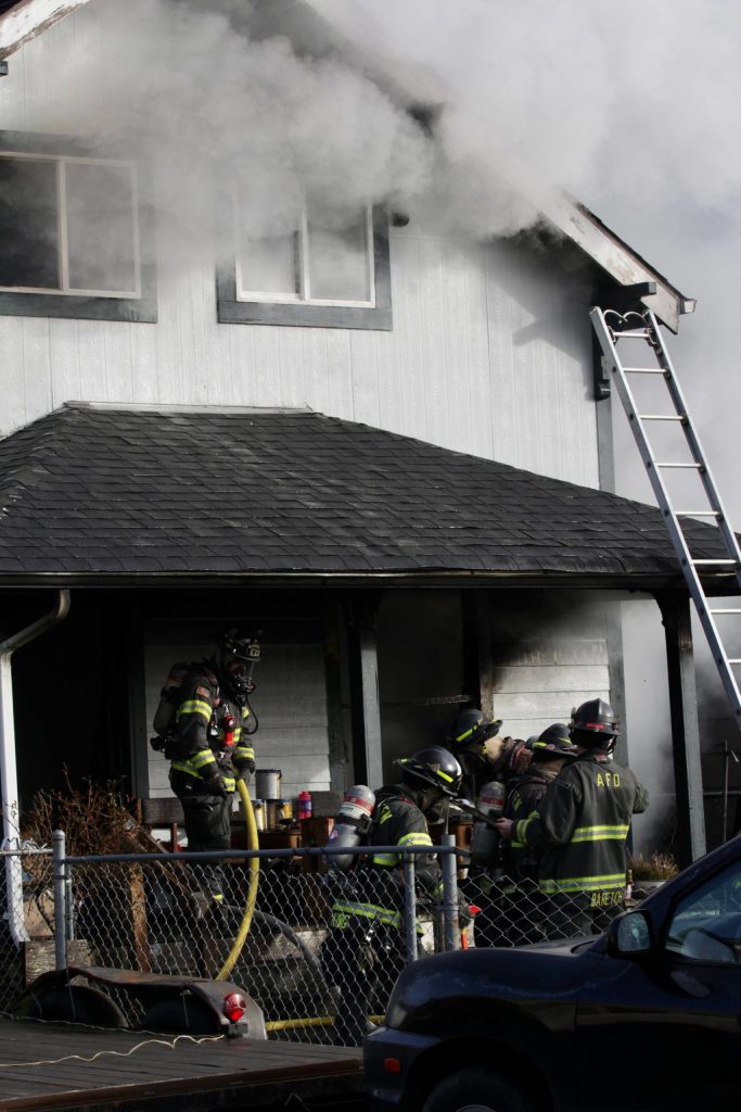 The Friday fire was first reported by multiple callers at about 9 a.m. A plume of smoke from the fire could be seen against the clear blue sky for miles, and drew in a crowd of a dozen onlookers as members of the Hoquiam and Aberdeen fire departments responded to the fire, while members of the Hoquiam Police Department blocked off roads to allow the firefighters room to work.