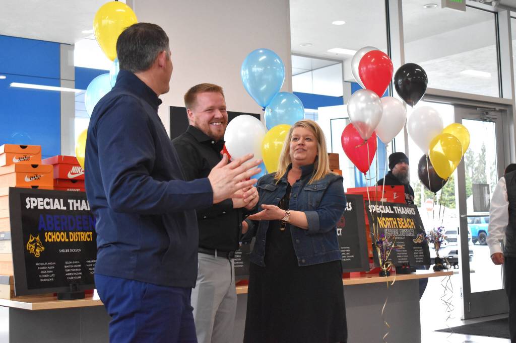 His goal was to give 70 pairs of brand new Nike shoes to the students to thank them for the work they did during the 22nd Annual United Way of Grays Harbor Black & White Gala, which Woolen attended. The gala, founded by Rich Hartman’s Five Star Dealerships and Jodesha Broadcasting, was held on Jan. 21, at the Ocean Shores Convention Center. The gala event raised more than $214,000. Woolen’s appearance and generosity put smiles on the faces of everybody in the dealership.