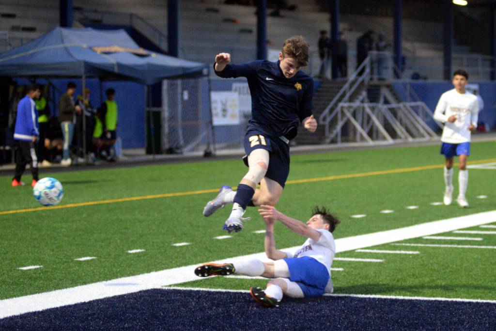 RYAN SPARKS | THE DAILY WORLD Aberdeen junior Evan Cone (21) leaps over a slide tackle during the Bobcats’ 5-0 victory over Rochester on Friday at Stewart Field in Aberdeen.