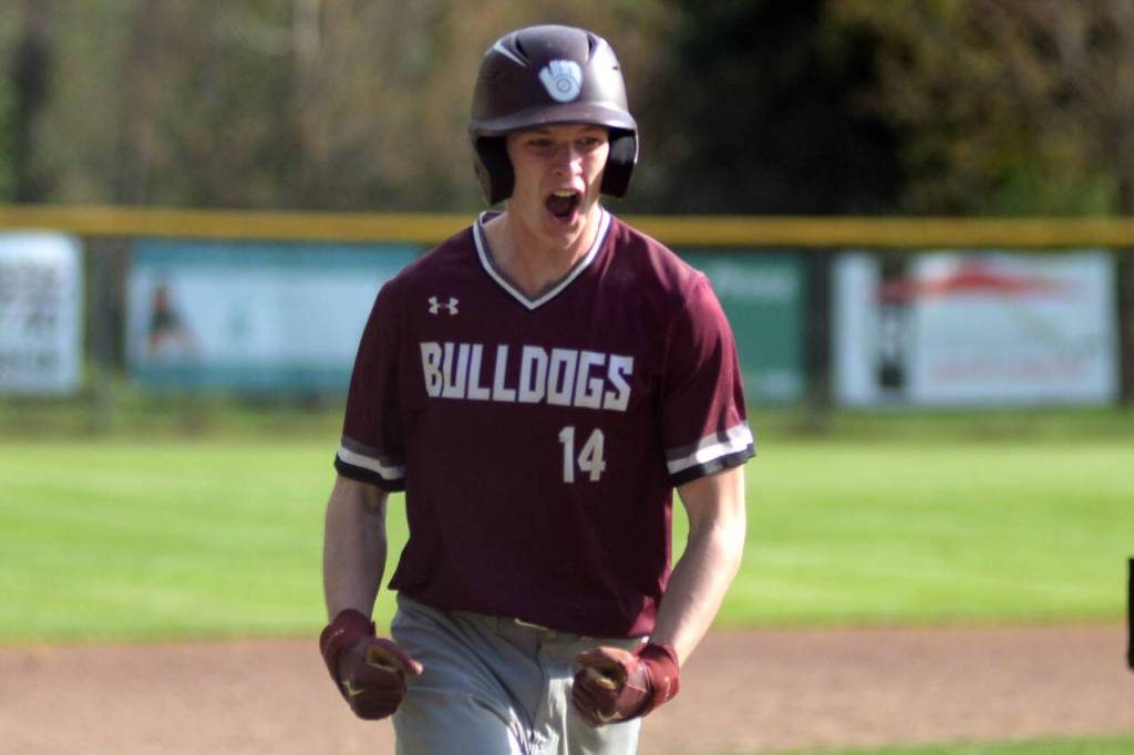 RYAN SPARKS | THE DAILY WORLD Montesano’s Kaleb Ames cheers after scoring a run during the first inning of the Bulldogs’ league-clinching 8-6 victory over Tenino on Tuesday at Vessey Field in Montesano.