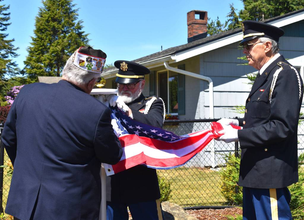 Tyler Marriott, Navy veteran from Elma VFW Bill Mann Post 1948, seemed impressed as he stood near the flag pole. Marriott was one of the veterans who hoisted the flags onto the pole that Veterans Affairs (VA) donated and installed.