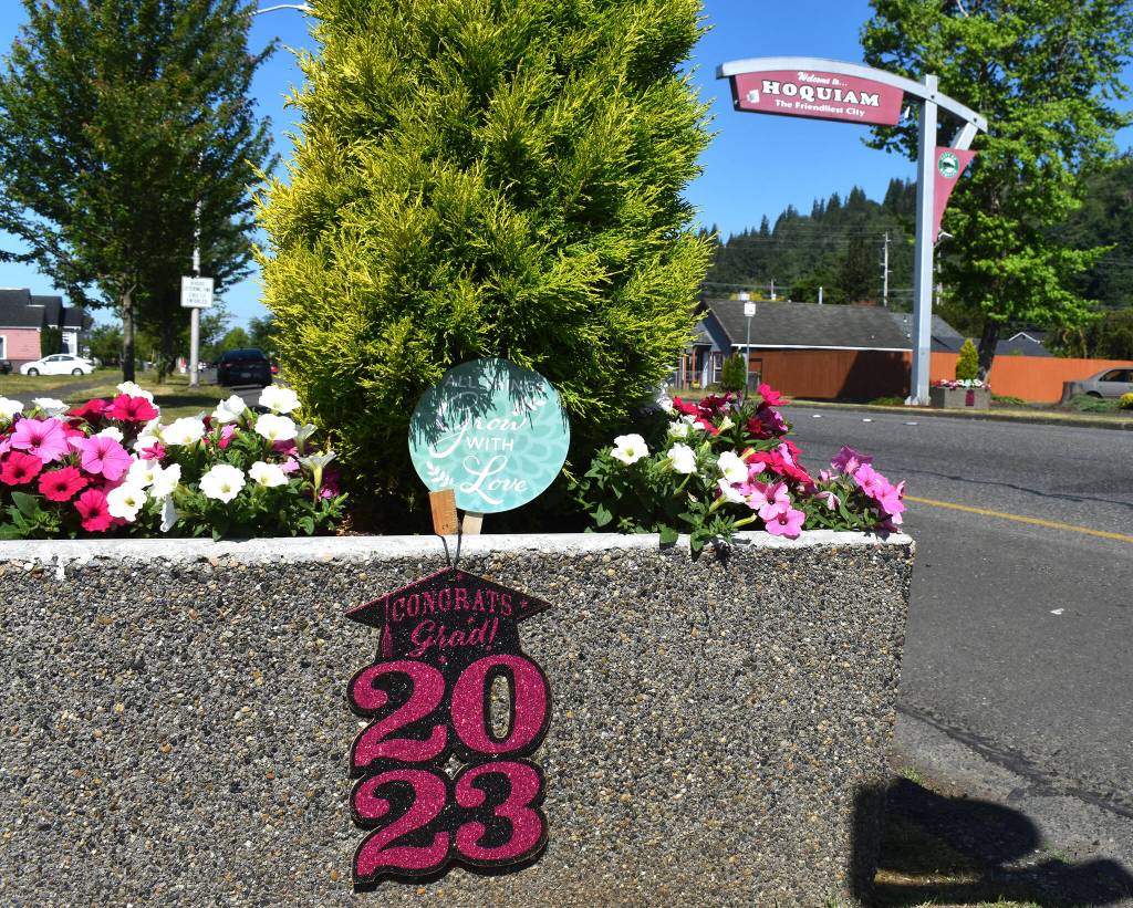 Two of those pots are on either side of the city line — Myrtle Street and Sumner Avenue — between Aberdeen and Hoquiam. One of the pots is near the “Hoquiam: The Friendliest City” sign and the other one is right in front of Raintree Veterinary Center — 300 Myrtle St., in Hoquiam. It’s clear the care that’s taken to make the flowers look beautiful. And since the new high school graduates ended their K-12 journeys, Seidel added an eloquent message to the flower boxes. She included her own congratulations to the high school graduates.