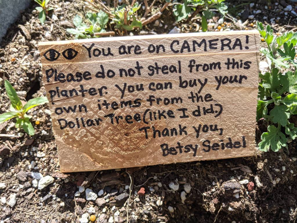 To take care of the pots in the midst of vandals, Seidel resorted to placing a wooden sign that said “You are on CAMERA! Please do not steal from this planter. You can buy your own items from the Dollar Tree (like I did.) Thank you, Betsy Seidel.”
