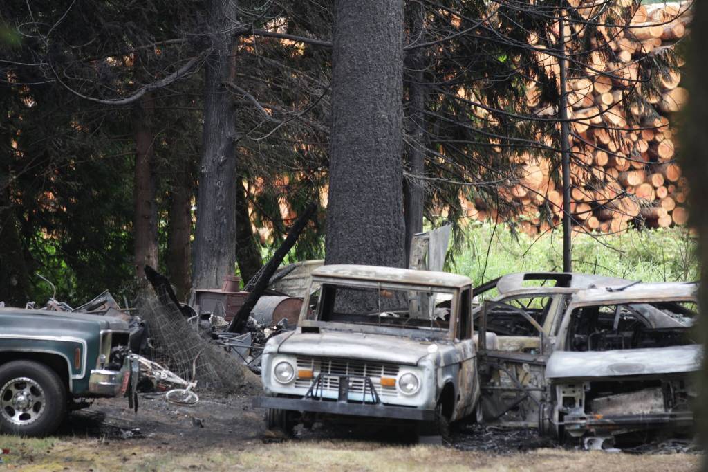 Charred trees and cars give mute testimony to a fire that threatened to grow out of control near Elma on Saturday.